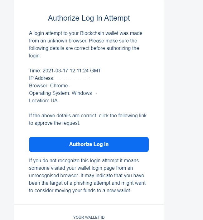 11. На странице blockchain.com вы должны увидеть окошко с уведомлением об авторизации. Теперь вы можете войти в свой кабинет (кошелек). ВАЖНО! Не забудьте сохранить ID вашего кошелька и доступы к нему.