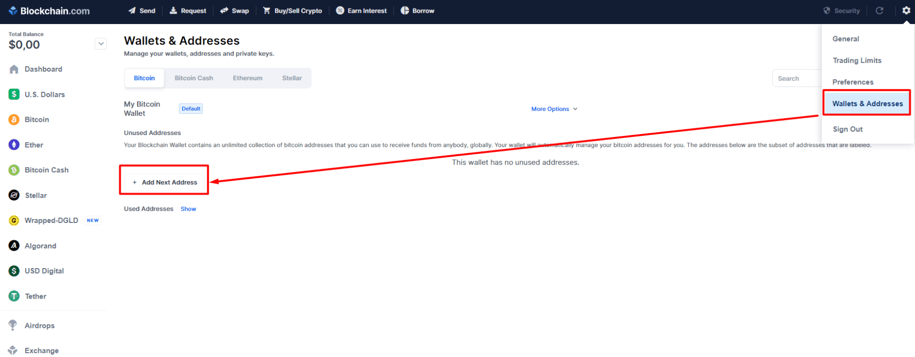 12. Заходим в свой кошелек, чтобы создать его адрес. Нажимаем иконку шестеренки (в правом верхнем углу), выбираем из меню Wallets & Addresses, затем + Add Next Address. Вам будет присвоен номер кошелька.
